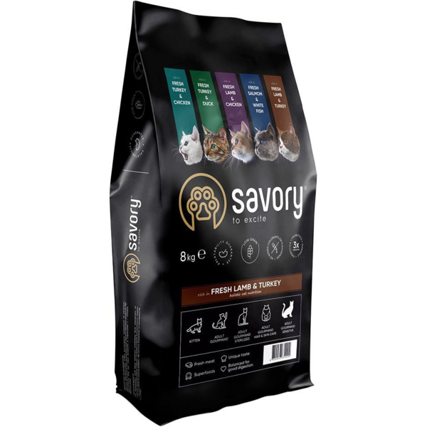 Rețeta exclusivă a hranei a fost dezvoltată de specialiști europeni experimentați în nutriția animalelor de companie. Folosind o abordare holistică, s-a creat o dietă sănătoasă, biologic adecvată pentru pisici, care este atât benefică, cât și delicioasă, încât „îți lingi labele”. Combinația de ingrediente naturale atent selecționate permite îngrijirea sănătății prietenului tău cu patru picioare, iar gustul rafinat îi oferă plăcere zilnică prin consumul hranei Savory.