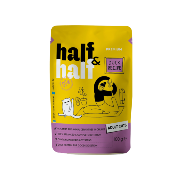 Hrana umeda completa HALF&HALF pentru pisici adulte cu rata, alegerea ideala pentru sustinerea sanatatii si vitalitatii pisicii tale. Asigura toti nutrientii esentiali, vitaminele si mineralele necesare pentru o piele sanatoasa, blana stralucitoare si energie zilnica.