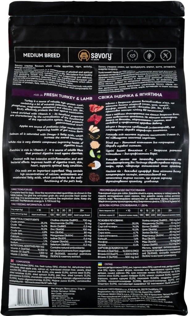Hrană uscată completa Savory pentru câini adulți de talie medie - cu carne proaspătă de curcan și miel, 3 kg