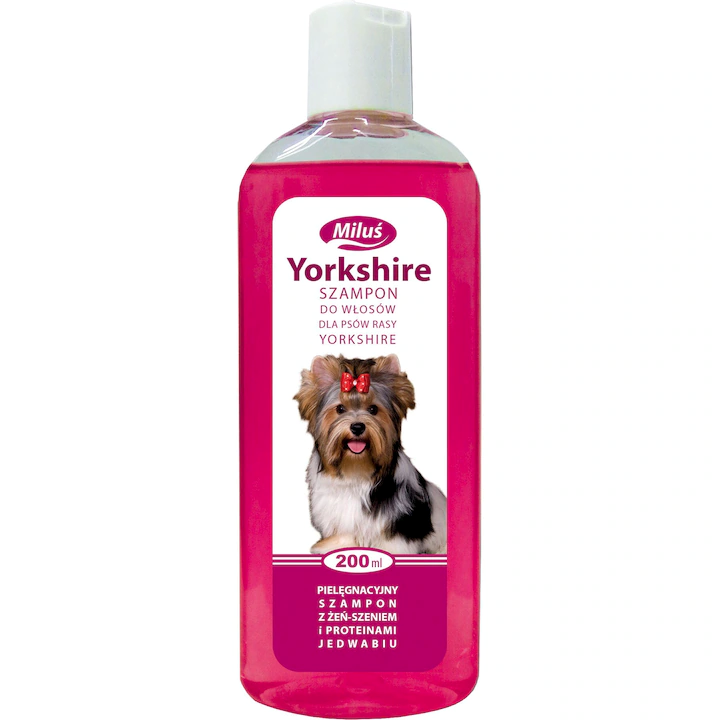 Sampon umed cu ginseng si proteine de matase, special formulat pentru blana delicata a cainilor din rasa Yorkshire Terrier.